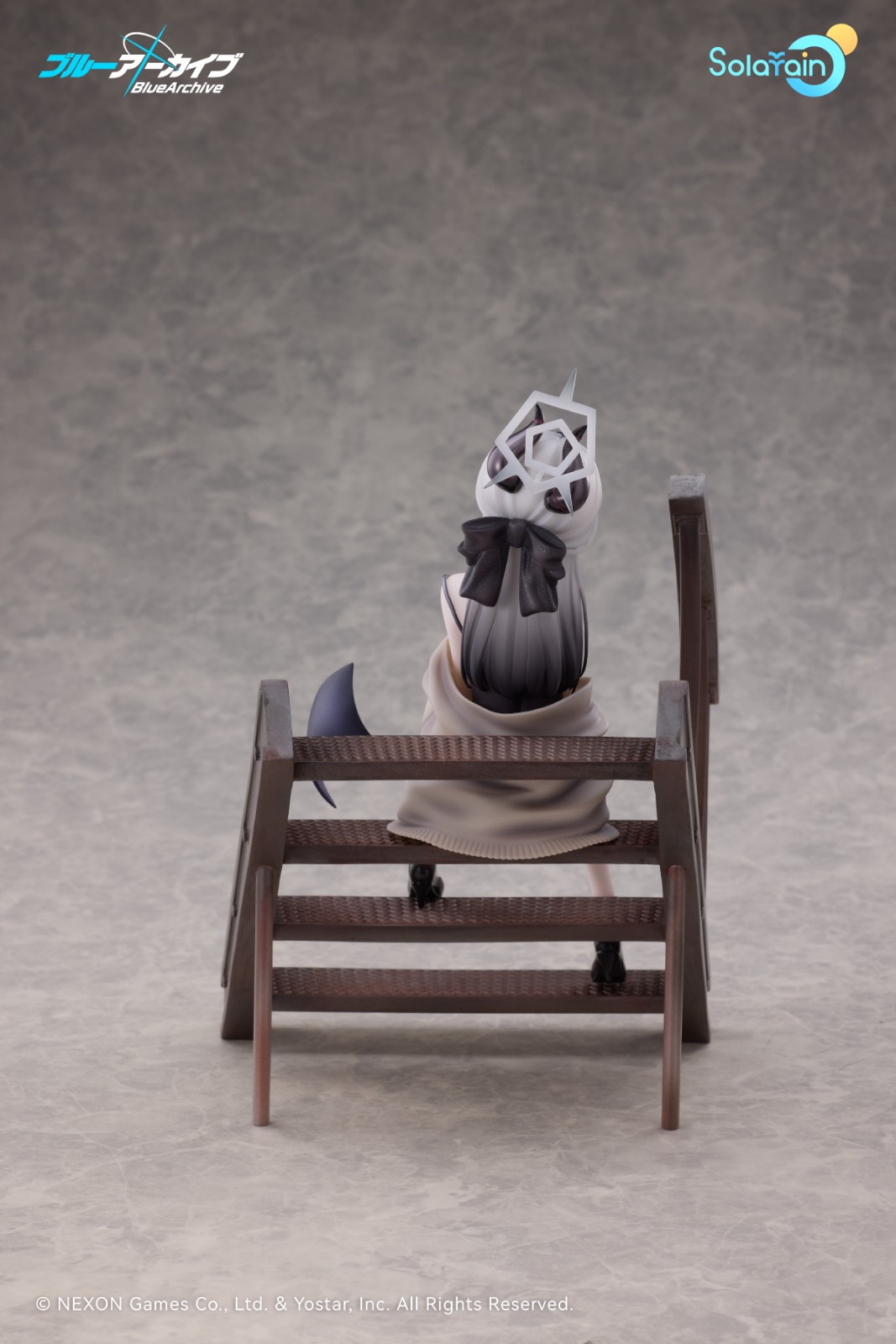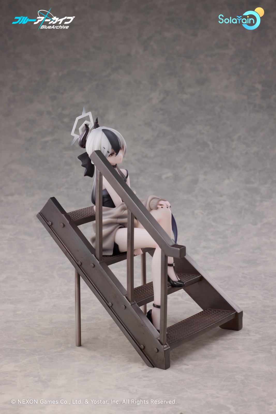 階段に腰を掛け、膝に手を添えたリラックスしたポーズ。脱ぎかけのカーディガンが柔らかく広がり、特徴的な片側の翼には淡い紫色の彩色が施されています。細めに開いた瞳でこちらを見つめる表情は、まるで猫のように気まぐれで、どこか甘えるような雰囲気も。